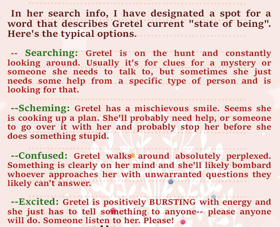 -- Gretel will attempt to solve every and any mystery or problem that she hears about. Even if it's something as simple as a broken mug at the Quicksand or as big as a serial killer on the loose. She's up for anything. Stop by her office in the Goblet for a free consultation, or just find her around town and say the word "mystery" within earshot.--Gretel is the daughter of Mason Woolf, a thief turned charlatan businessman turned "nobleman". Maybe you'd know her through him! He's incredibly rich, incredibly morally gray, and incredibly down to sleep with whoever's willing.-- Wanna play a simple game of cards? Well, no game with Gretel is simple, as she is a serial cheater. Perhaps you'll catch her in the act!-- Gretel can be found picking flowers around the Shroud most mornings. She affixes them into flower crowns, makes tea, or donates them to a Gridanian florist.